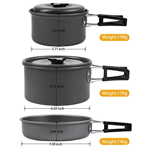 [ln] 2 camping pots, 1 camping pan and 3 bowls, good for 2-3 people. [ln] [ln]- [ln] Non-stick cookware: This lightweight cooking set is a kind of non-stick cookware and made of FDA APPROVED non-toxic anodized aluminum, which makes it solid, light and durable. [ln] [ln]